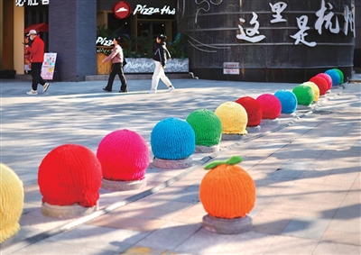 杭州给石墩子和雪糕筒 穿上了“毛衣”