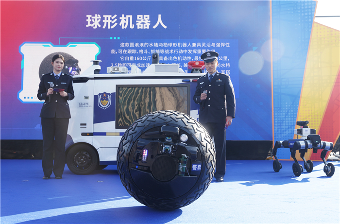 最吸睛的当属警用机器人展示环节。现场,科技科副科长谢世雄带着球形机器人、警用无人车、水下机器人、轮式四足机器人、警用无人机、反诈机器人等“科技伙伴”轮番亮相,它们走位灵活、技能满点,科技感爆棚,直观展现了科技赋能警务工作带来的大变化,也让大家看到了钱塘公安的硬核新实力。