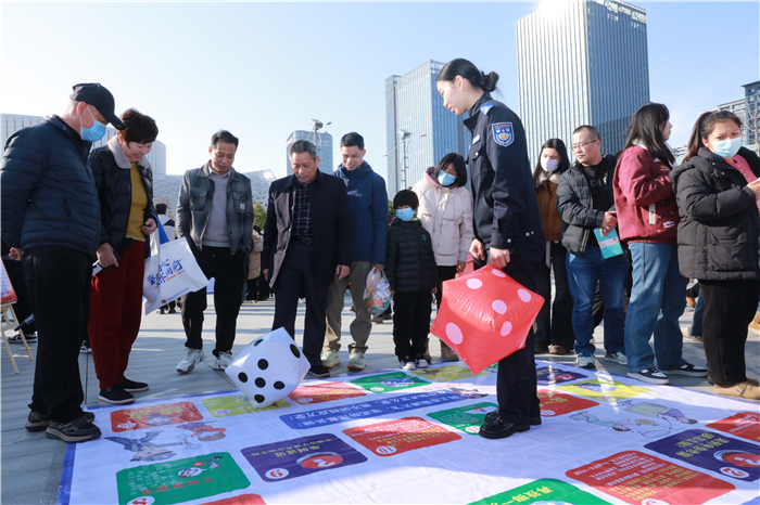 刚在舞台上精彩演出的“科技小伙伴们”静静地待在机器人展示摊位后,一大波没有“过瘾”的群众纷纷赶来,近距离观摩它们的风采。“潮”趣识诈摊位前,反诈飞行棋、反诈套圈等趣味游戏吸引了大家广泛参与,民警还会在游戏间隙讲解反诈知识,大家在欢快的氛围中掌握反诈知识。