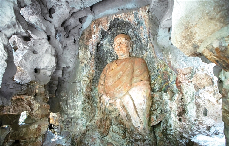 这里所提到的佛像,就是在半山腰无门洞里的慧开塑像。据考证,这尊塑像高约3.6米,雕造年代有多种说法,明代文献认为它是慧开为自己雕造的半身肖像,也有说法是元代或者明代时后人雕造纪念的。原始的石雕慧开像已毁,目前看到的是现代人补做的泥塑像。