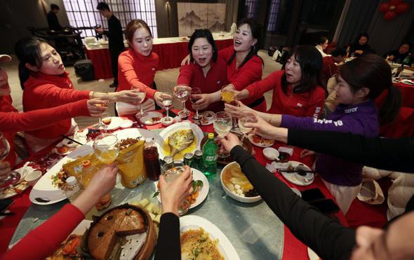这次联欢会,队员们早早预订了6桌,每桌12人。这场联欢会经费都是大家自发凑份,桌上的杨梅酒、米酒、葡萄酒由热心队员赞助,人人有奖的杯子、雨伞,也来自队员或其亲友的捐赠。一切源于自愿,一切归于情谊。