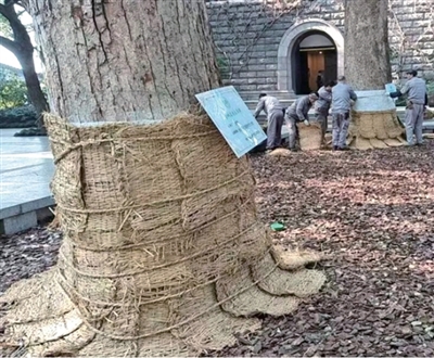 因为古树名木和盆栽的抗寒能力比较弱,它们还多穿了一件“防寒服”。为了避免低温冻伤植被的根系和枝干,工作人员会在树干底部周围铺上稻草垫,既能挡住地面的寒气渗进来,又能减少土壤里水分流失。同时,管理处还安排了专人定期检查这些稻草垫,要是发现有破损、受潮的情况,会及时更换,把防寒措施做到位,尽量把低温对古树和盆栽的伤害降到最低。