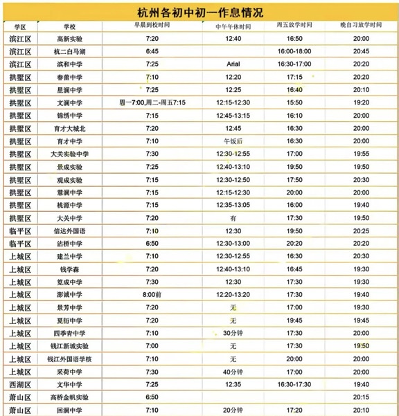 现实情况是,杭州各区初中初一学生的到校时间普遍较早,大多集中在7:00-7:30之间。但也有更“卷”的,例如杭二白马湖、沾桥中学等,要求学生7点前到校;澎城中学则相对宽松。整体而言,孩子们普遍需要在7点前后出门,这意味着全家都得跟着早启动,尤其是住得远或怕堵车的家庭,清晨6点多就得忙活起来。