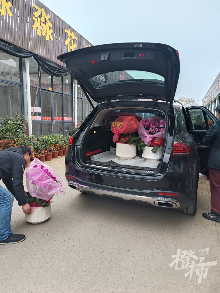 “小刘园艺”门口停着一辆奔驰SUV,两盆蝴蝶兰被装入后备箱,一盆蝴蝶兰被放在驾驶室的后座上,地上还有一盆蝴蝶兰。开车的大姐说,这不要过年了,买了4盆蝴蝶兰,她每年都会来这个市场找小刘买花。
