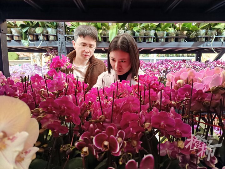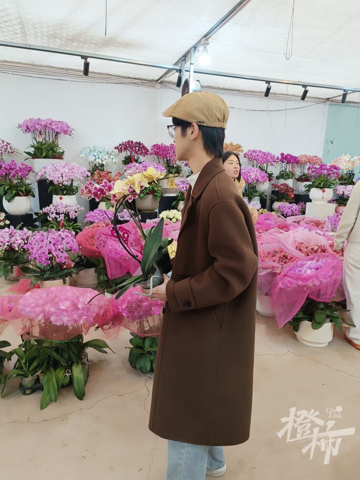 30多岁的胡女士和老公鲍先生正在“景瑟花店”的蝴蝶兰货架旁精心挑选心仪的花株。胡女士说,过年前她都会来这里买鲜花,已经有5年了,一般都是买蝴蝶兰和冬青,过年嘛,家里摆上鲜花会更喜庆。蝴蝶兰花期长,能开好几个月,现在买一直到过年都会很好看的。“蝴蝶兰对温度和湿度要求还是很高的,我的养花水平不算好,平时上班也忙,对花管得也少,可能是水浇多了容易烂根,我的同事就很会养,她养的蝴蝶兰第二年还会复开花,我很羡慕,我就只能每年重新买,家里大大小小的花盆已经存下来很多,大花盆能种八到十株蝴蝶兰,小花盆能种二三株。昨天,我们带了3个小花盆来试试,看看能不能只买花,花盆用自己的,这样就能省下买花盆的钱。”