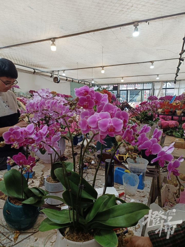 40岁的周女士也在选购鲜花,每年过年前她都会来这里买鲜花。“1月19日(明天)我朋友过生日,昨天过来主要是买一盆蝴蝶兰送朋友。”周女士说,“刚好自己也看上了一盆,顺带给自己也买一盆。今年过年晚,年前还得再来买两盆蝴蝶兰,蝴蝶兰花期长,开上两三个月花还是很好看的,接上过年没问题。”