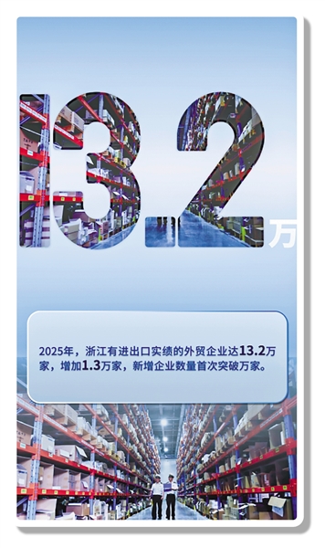 外贸韧性的背后,是活跃且不断壮大的经营主体。2025年,浙江有进出口实绩的外贸企业达13.2万家,增加1.3万家,新增企业数量首次突破万家。其中民营企业数量12.3万家,增加11.8%,进出口4.56万亿元,增长7.1%,占全省进出口总值的82.1%;外资企业数量达8025家,首破8000大关。