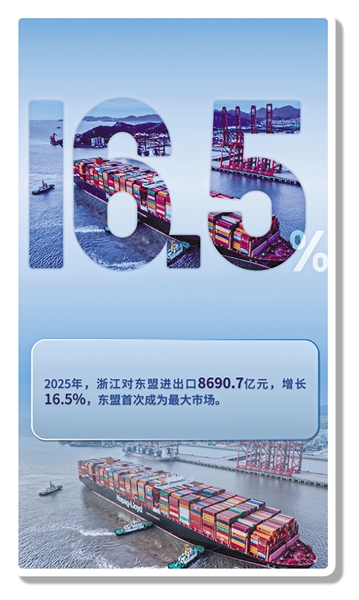 新兴市场渐成浙江外贸主角。2025年,浙江与240多个国家和地区有贸易往来,与180多个国家和地区进出口实现增长。对前两大贸易市场东盟、欧盟分别进出口8690.7亿元和8457.4亿元,增长16.5%和8.7%,东盟首次成为最大市场。对中东、拉美、非洲等新兴市场进出口分别增长3.5%、3.7%、11.5%。此外,对共建“一带一路”国家进出口首破3万亿元,达3.19万亿元,增长8.7%。