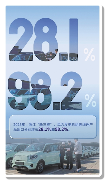 出口商品向新向绿。2025年,浙江机电产品出口1.97万亿元,增长9%,占出口总值比重达47.0%,提升0.8个百分点。高技术产品出口3580亿元,增长12%;“新三样”、风力发电机组等绿色产品出口分别增长28.1%和98.2%。