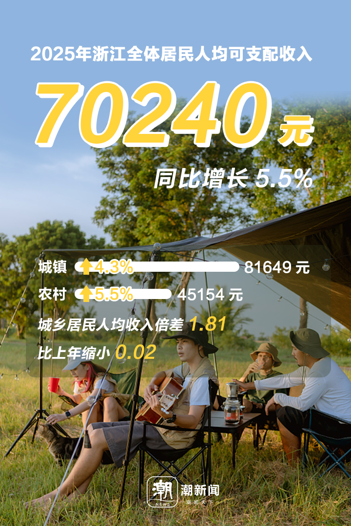 据浙江省统计局通报的最新数据显示,2025年,浙江全体居民人均可支配收入70240元,突破7万元大关,比上年名义增长4.8%。其中,城镇、农村居民人均可支配收入分别为81649元和45154元,分别增长4.3%和5.5%。城乡居民人均收入倍差1.81,比上年缩小0.02。城乡收入差距继续缩小。