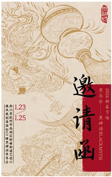 从全球大火的游戏到艺术展再到专门的衍生品零售店,杭州出品的“黑神话”IP的每一场活动都引发了粉丝的关注。这个周末(1月23日-25日),一场名为“黑马会”的新春主题线下活动将在杭州举行。活动以传统年俗为灵感,融合游戏IP体验、互动玩法、市集消费与艺术合作,为玩家和市民打造一场具有东方文化气质的沉浸式新年体验。