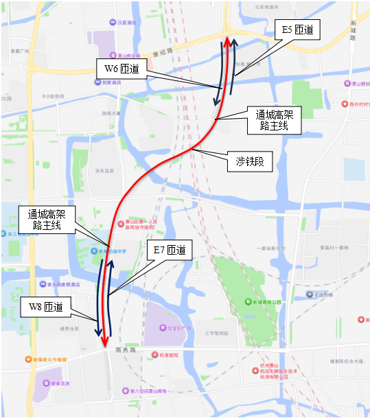 E5、W6分别为通城高架萧绍路南侧一对平行上下匝道;E7、W8为通城高架南秀路北侧一对平行上下匝道。配合高架段开通,拱秀路(商城南路-滨水路)和商城南路地面道路(拱秀路-新螺路)段进行临时保通。