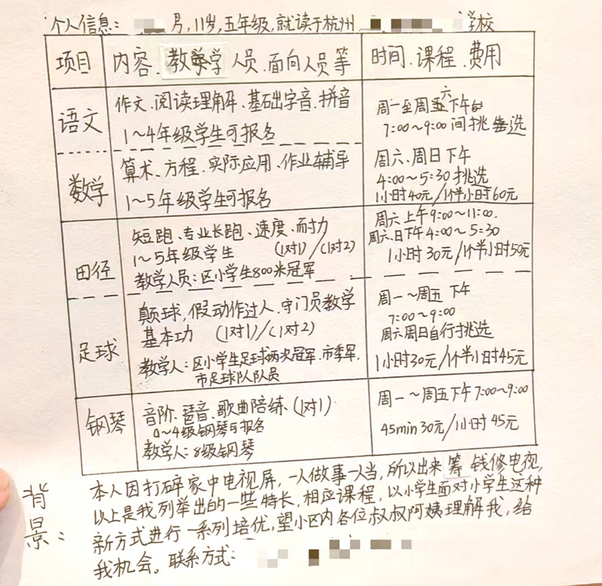 儿子“尧哥”五年级时,不小心打破了家里新的液晶电视屏。面对6000元的换屏费,尧哥决定“创业”还债。他让妈妈帮忙把自己的“广告”发到小区业主群里,情真意切地道出自己创业的背景:“本人因打碎家中电视屏,一人做事一人当,所以出来筹钱修电视。以上是我列举出的一些特长,相应课程,以小学生面对小学生这种新方式进行一系列培优。望小区内各位叔叔阿姨理解我,给我机会。”