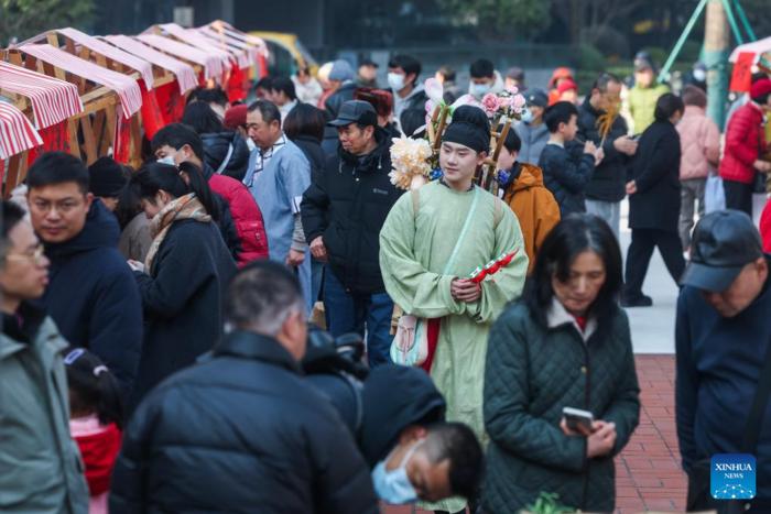 People are pictured during a fair featuring intangible cultural heritage and Chinese New Year goods in Hangzhou, east China's Zhejiang Province, on Jan. 24, 2026. Kicking off in Hangzhou on Saturday, the event blends traditional festivities with modern trends, offering visitors an immersive experience of cultural crafts, holiday shopping, and folk performances. (Xinhua/Xu Yu)