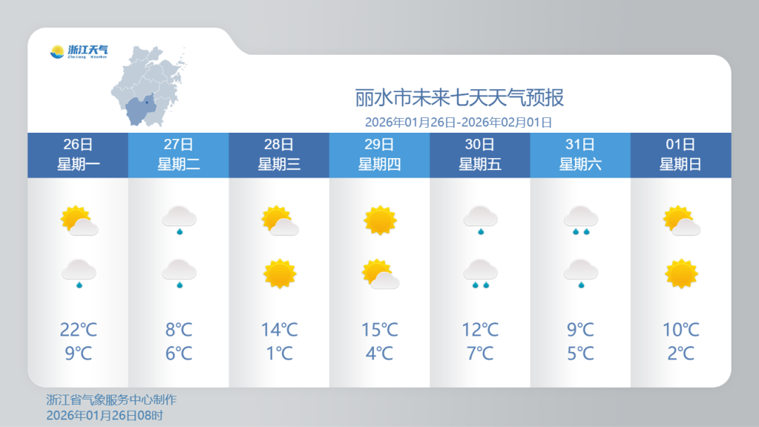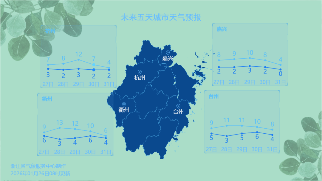 注意了!27日也就是明天,浙中南也进入降温圈,气温大幅下调,比如丽水,预计今日最高22℃,明天仅8℃,一天内最高气温暴跌14℃;同时山区明夜局部有小雨夹雪或小雪。