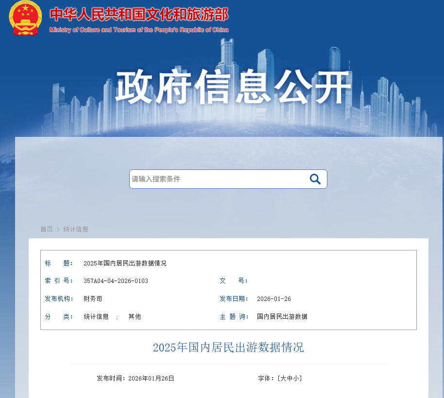 根据国内居民出游抽样调查统计结果,2025年,国内居民出游人次65.22亿,比上年同期增加9.07亿,同比增长16.2%。其中,城镇居民国内出游人次49.96亿,同比增长14.3%;农村居民国内出游15.26亿,同比增长22.6%。