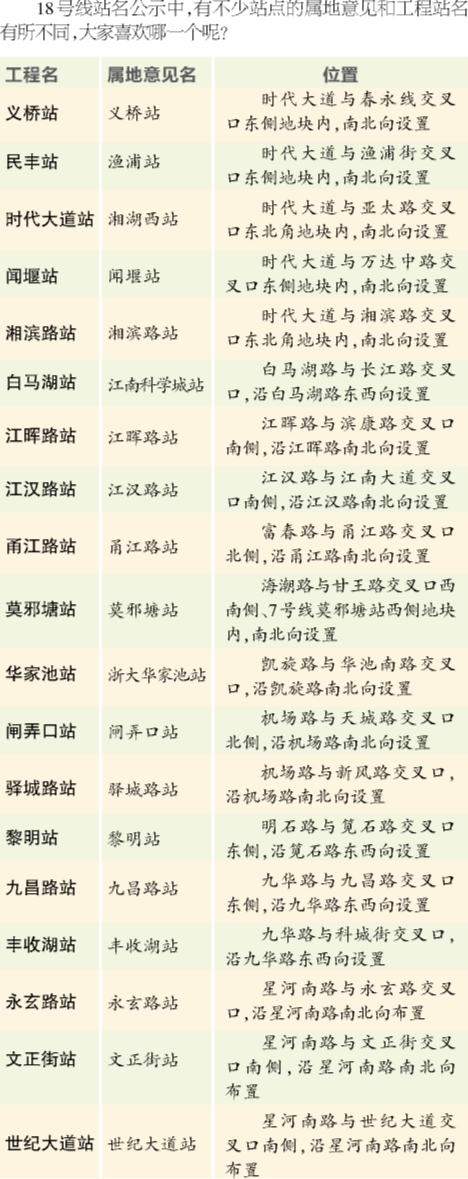 杭州地铁18号线一期工程的新建车站站名拟命名方案,在征集相关属地单位意见后,现在正在进行公示。