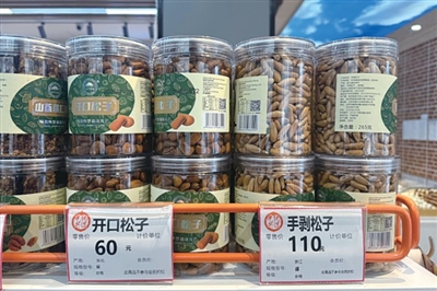货架上还有罐装的,265克装的手剥松子110元/罐,算下来208元/斤,比散装的还贵一点。