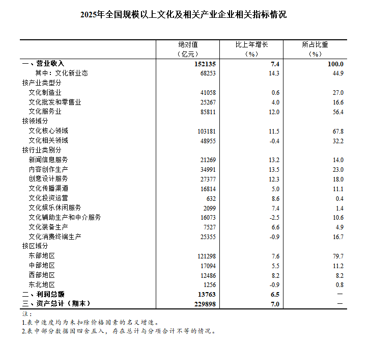 央视网消息:据国家统计局消息,据对全国8.2万家规模以上文化及相关产业企业(以下简称“文化企业”)调查,2025年,文化企业实现营业收入152135亿元,按可比口径计算,比上年增长7.4%。其中,文化新业态特征较为明显的16个行业小类实现营业收入68253亿元,比上年增长14.3%,快于全部规模以上文化企业6.9个百分点。