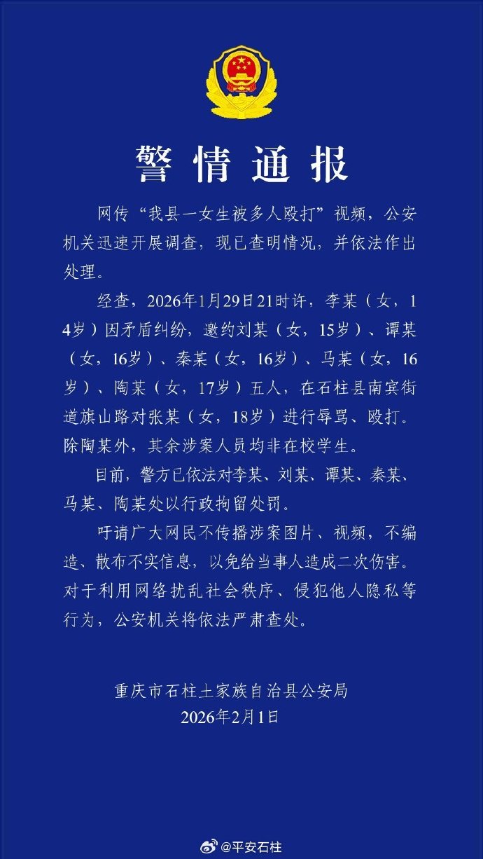 重庆石柱县一女生疑被多人拳打脚踢?警方:6人被行政拘留