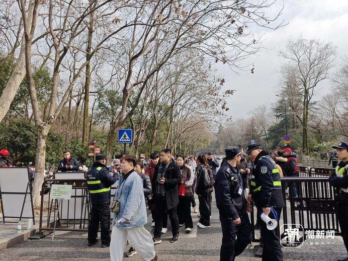景区外围的灵竺路上,拉起百来米长的铁马护栏,隔出一个人车分流的通道。在这个通道入口卡口处,有保安和志愿者正在查验入园预约凭证,地上还有一块绿色告知牌,温馨提醒“自2月1日起,不再受理现场登记”,现场广播滚动播放、反复提醒。