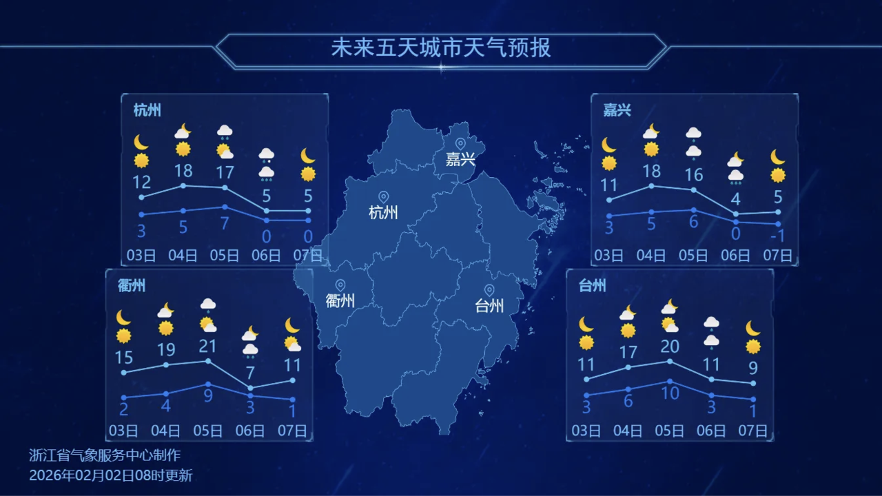 回温只是开始,未来三天,气温还会继续拉升。预计,2月4日这天,浙北地区达到这波回温的顶点,大部地区最高气温可达18~19℃,浙中南地区5日会更暖一些,丽水、温州最高气温可达22~23℃。