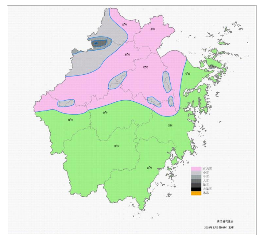 5日夜里起全省阴有雨,浙北地区中雨,部分大雨;6日中午至夜里浙中北部分地区将先后转雨夹雪或雪,浙西北高山区有大到暴雪,浙南山区局部有冻雨;7日上午起全省雨雪渐止转阴天,但浙中南山区局部仍有雨夹雪或雪。
