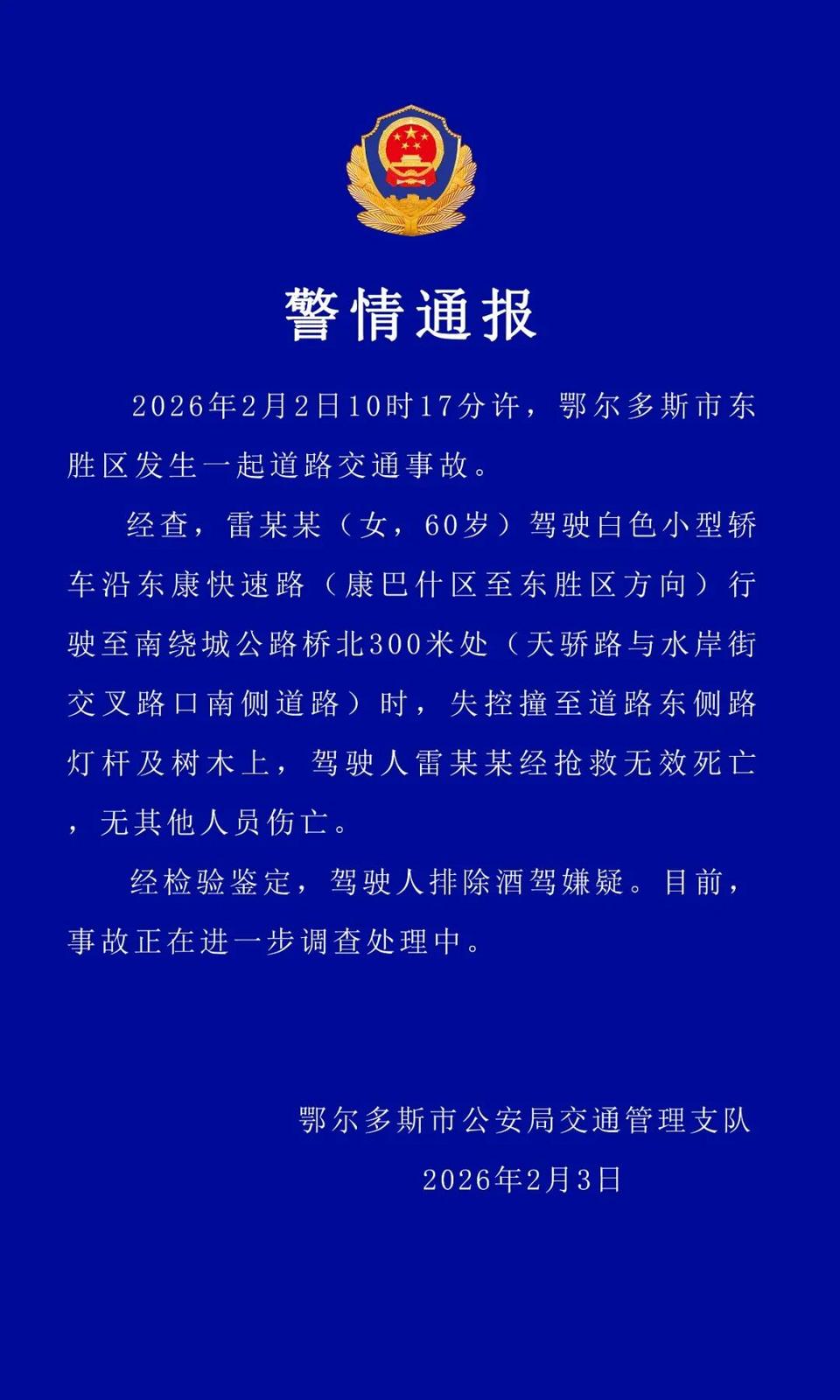 鄂尔多斯警方通报:雷某某(女,60岁)驾车失控撞至路灯杆及树木上,经抢救无效死亡,事故正进一步调查处理中
