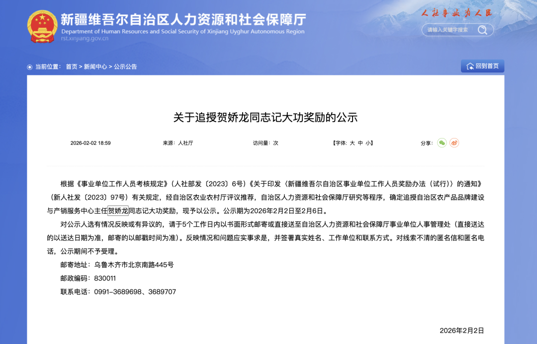 记者从新疆维吾尔自治区人力资源和社会保障厅获悉,自治区人社厅2日发布公示,确定追授已故新疆农产品品牌建设与产销服务中心主任贺娇龙同志记大功奖励。