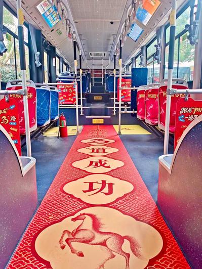 车厢内部同样年味十足。脚下“踏一步,进一步”的地贴暗藏“马到成功”的美好期许,拉手与椅背上的喜庆图案和祝福语,让短暂的乘车时光成为沉浸式的年俗体验。更令人惊喜的是,151路正式成为杭州第二条采用方言报站的公交线路,杭州人熟悉的“阿六头”——《阿六头说新闻》主持人安峰受邀献声,用亲切幽默、字正腔圆的地道杭州话录制了全套报站语音。“终点站雄镇楼到嘚,欢迎再来坐151路公交车,再会”,熟悉的乡音让公交旅途更添温度。从大年三十到正月底,151路首末站还将循环播放安峰录制的春节祝福,让年味一路相伴。