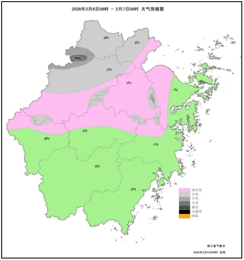 雨(雪)预报:明天(6日)降水较明显,浙北地区部分中雨局部大雨。明天中午起自北而南有一次雨雪转换过程。浙北山区率先转雨夹雪或雪,部分中到大雪,高山区局部暴雪;下午起浙北部分平原地区有雨夹雪,傍晚起雨夹雪或雪;夜里至7日早晨浙中地区和浙南山区部分雨转雨夹雪或雪,其中浙西南山区局部有冻雨。7日中午全省雨(雪)止。此次过程湖州、嘉兴西部、杭州北部等地部分有1~3厘米积雪,浙北海拔400米以上山区积雪3~7厘米,高海拔山区最大8~15厘米。