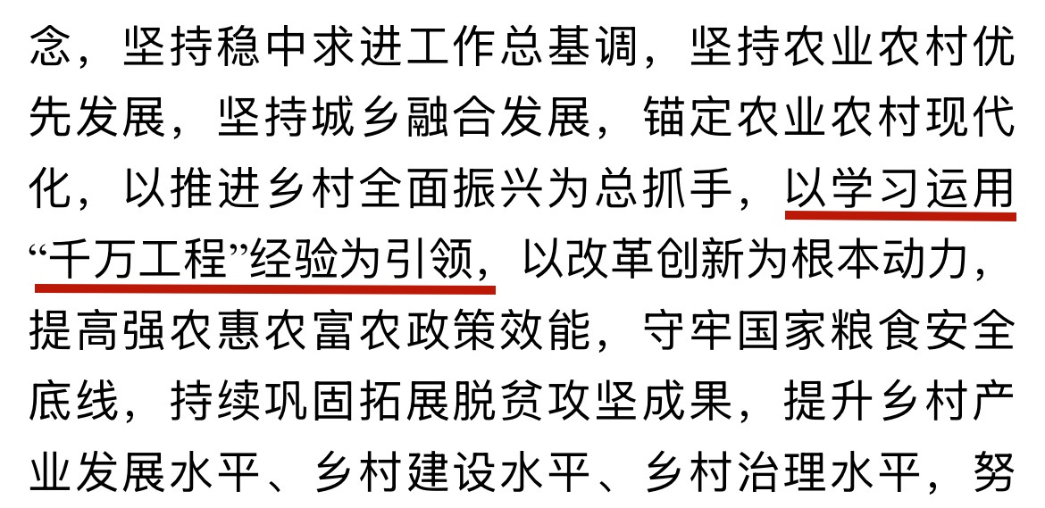 自2024年中央一号文件首次把“千万工程”作为典型案例写入标题后,“千万工程”已连续三年被写入中央一号文件,充分体现了党中央对乡村振兴战略的高度重视和坚定决心。