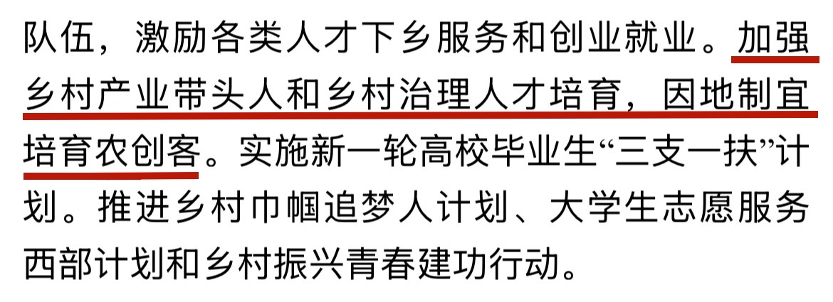 此外,“农创客”一词今年也首次出现在文件中。文件提出:“加强乡村产业带头人和乡村治理人才培育,因地制宜培育农创客。”