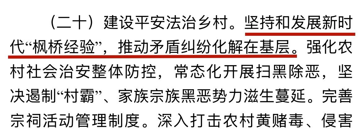 在“建设平安法治乡村”方面,“枫桥经验”四字格外醒目,这意味着——又一项首创于浙江的基层治理经验被写入中央一号文件,上升为国家部署。