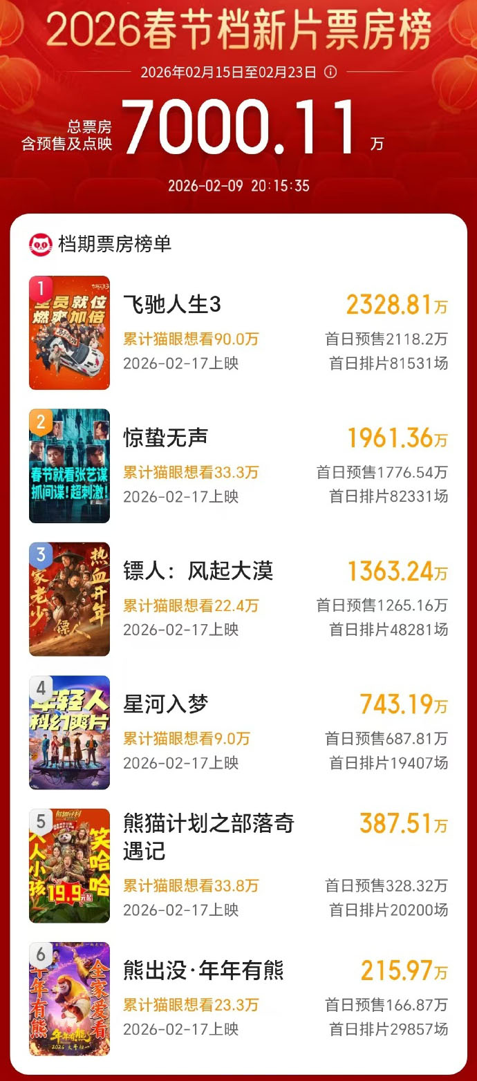 央视网消息:据网络平台数据,2026年春节档新片预售总票房破7000万,《飞驰人生3》《惊蛰无声》《镖人:风起大漠》分列2026年春节档新片预售票房榜前三。