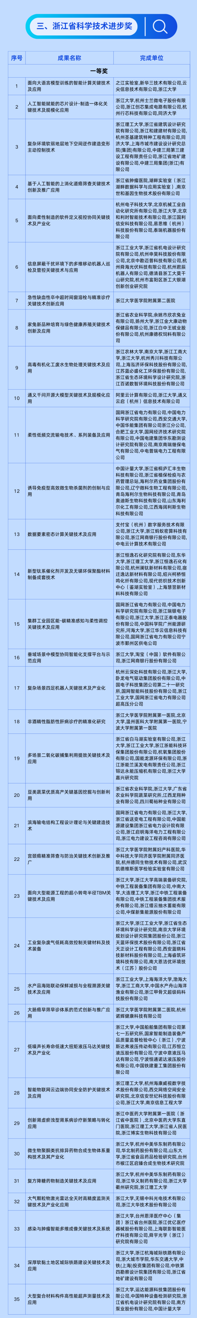 从创新主体看,杭州新研机构、科技企业等创新主体核心竞争力持续增强。之江实验室连续三年获省科技进步一等奖,白马湖实验室首次获省科技进步一等奖。阿里云、支付宝、恒逸石化研究院、云深处、国网电力等5家科技企业牵头的8个项目获省科技进步一等奖,较上年度增长2项。