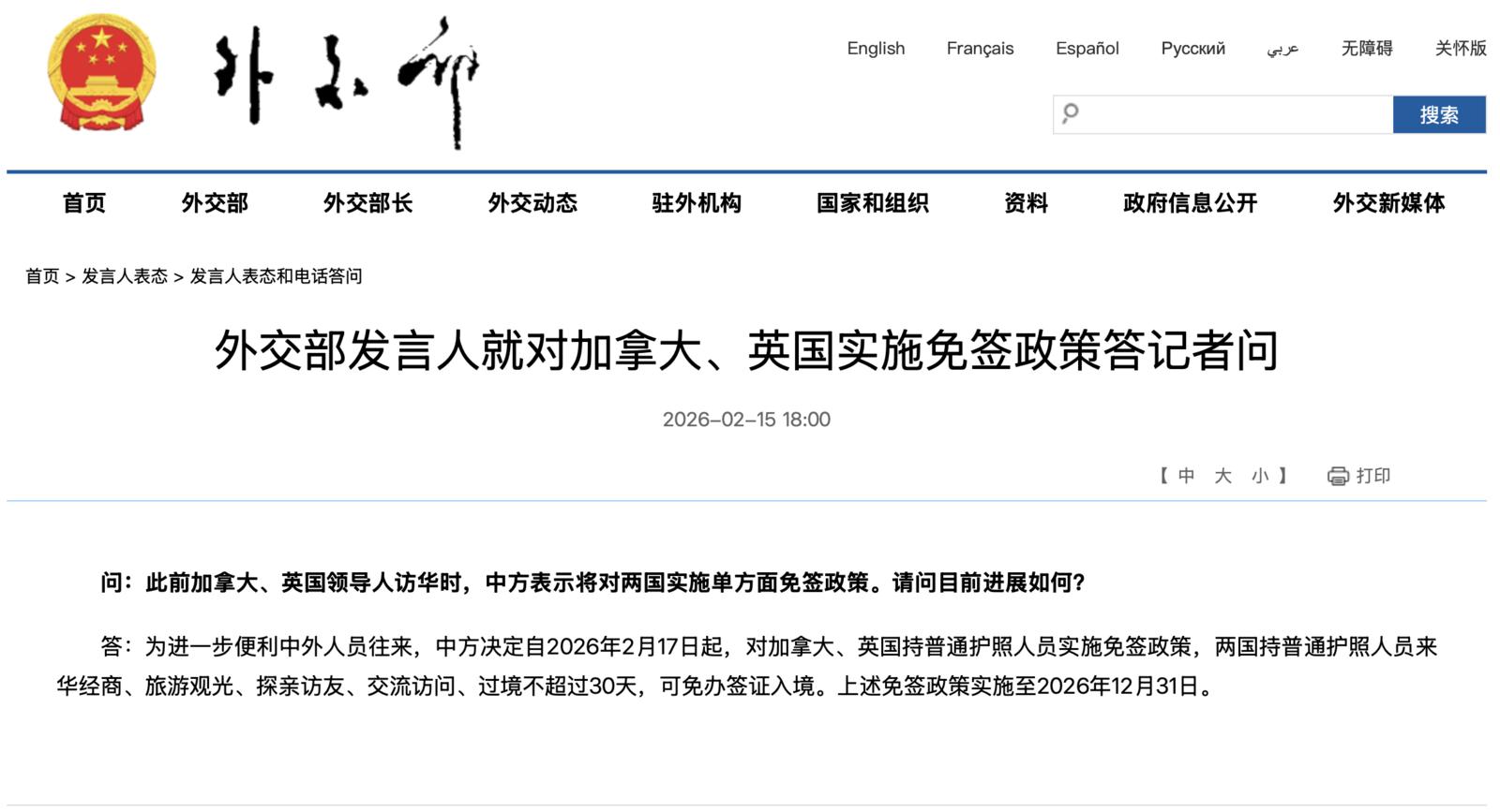答:为进一步便利中外人员往来,中方决定自2026年2月17日起,对加拿大、英国持普通护照人员实施免签政策,两国持普通护照人员来华经商、旅游观光、探亲访友、交流访问、过境不超过30天,可免办签证入境。上述免签政策实施至2026年12月31日。
