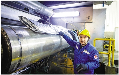 在一台正在生产15微米厚度铝箔的轧机控制室,记者看到屏幕上实时跳动着滚筒转速、长度等数据。一卷7万米长的原料铝箔,在这里经过约3.5小时的轧制,变成厚15微米、长约15万米的产品。