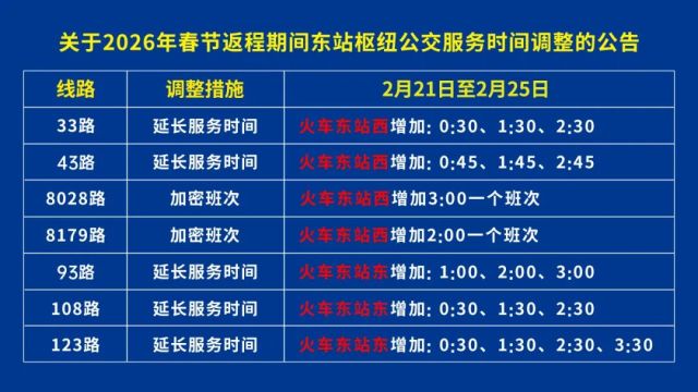 2、43路,2月21日至2月25日,火车东站西增加0:45、1:45、2:45三个班次。其余不变。