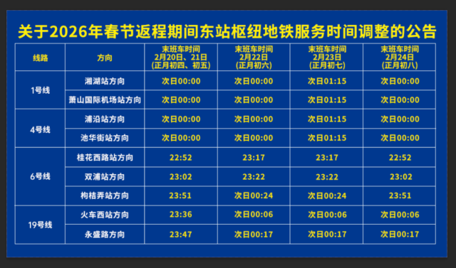 地铁火车东站(1、4号线)末班车延长至次日1:15,地铁火车西站(19号线)延长至次日0:30。