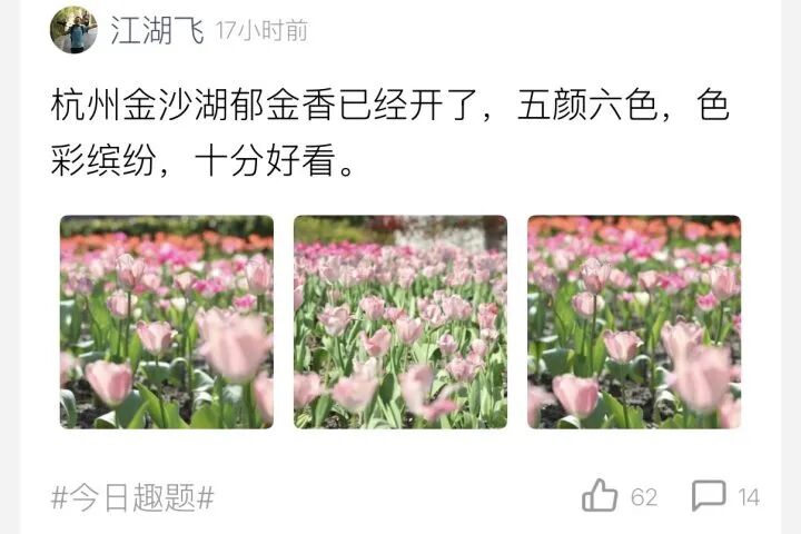 上周这轮大回暖下,宁波今天也宣布已于本月20日入春,比常年(3月9日)早了17天。杭州也是春意盎然,不少橙友爆料,杭州太子湾公园、金沙湖公园里,最近已经有一批 “心急” 的郁金香悄悄绽放,抢先把春天送到了眼前。