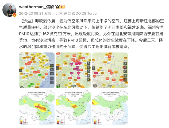 今天是春节长假的最后一天,老天爷十分给面子,原以为会有严重的沙尘来扰,没想到昨夜东风出力,吹散了不少污染物,今早杭州的空气质量回升到了良。夜里还有一场雨水将上线,空气质量有望进一步得到改善。