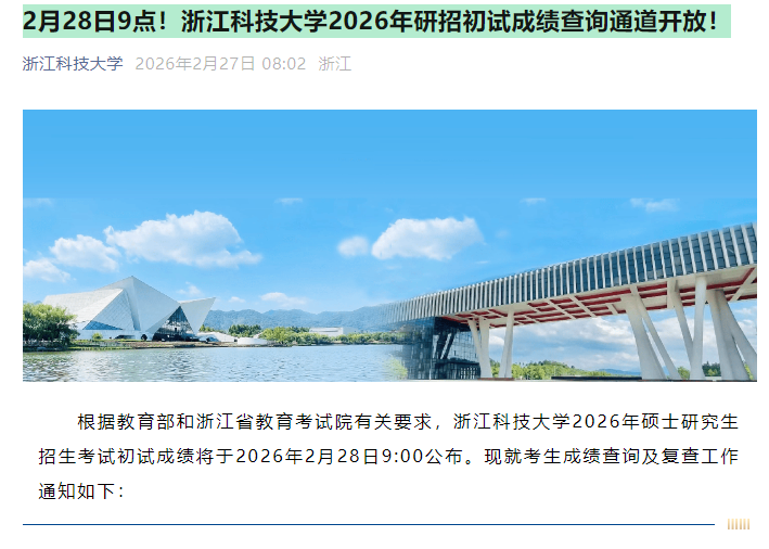 2月27日一早,浙江省内多所高校的官方微信公众号发布信息称,根据教育部和浙江省教育考试院有关要求,2月28日9时,2026年硕士研究生招生初试成绩查询通道开放。