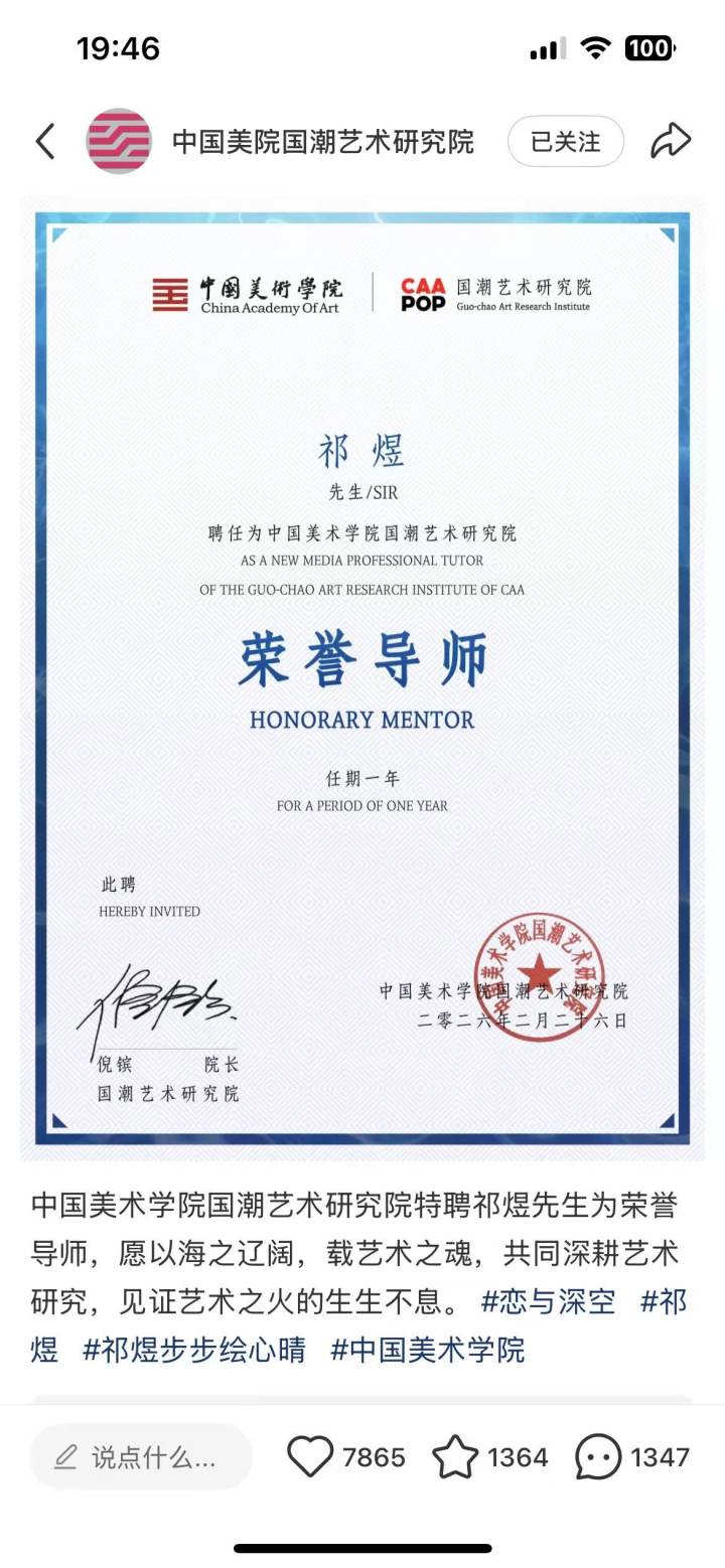 据了解,祁煜担任荣誉导师的中国美术学院国潮艺术研究院成立于 2021年。院长为倪镔教授,其曾任《仙途》艺术总监,参与《深海》《大鱼海棠 2》动画概念设计。在此次活动中,中国美术学院国潮艺术研究院也表示:“愿以海之辽阔,载艺术之魂,共同深耕艺术研究,见证艺术之火的生生不息。”