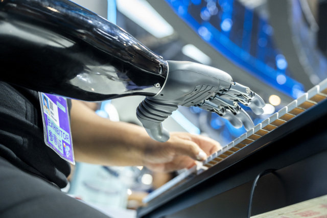 在仿生手的帮助下,强脑科技的工作人员用“意念”弹奏钢琴。记者 王毅 摄