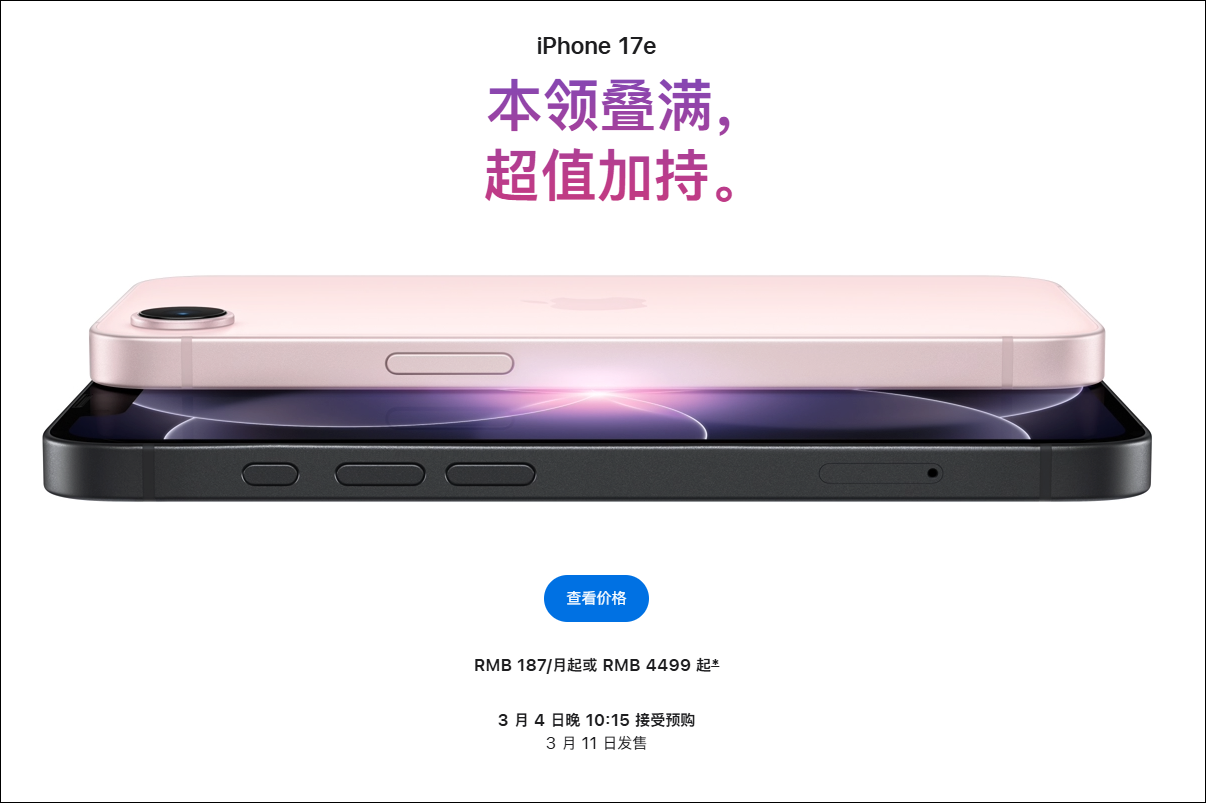 3月2日,苹果在官网直接上线iPhone 17e,起售价格为4499元,将于3月11日正式发售。