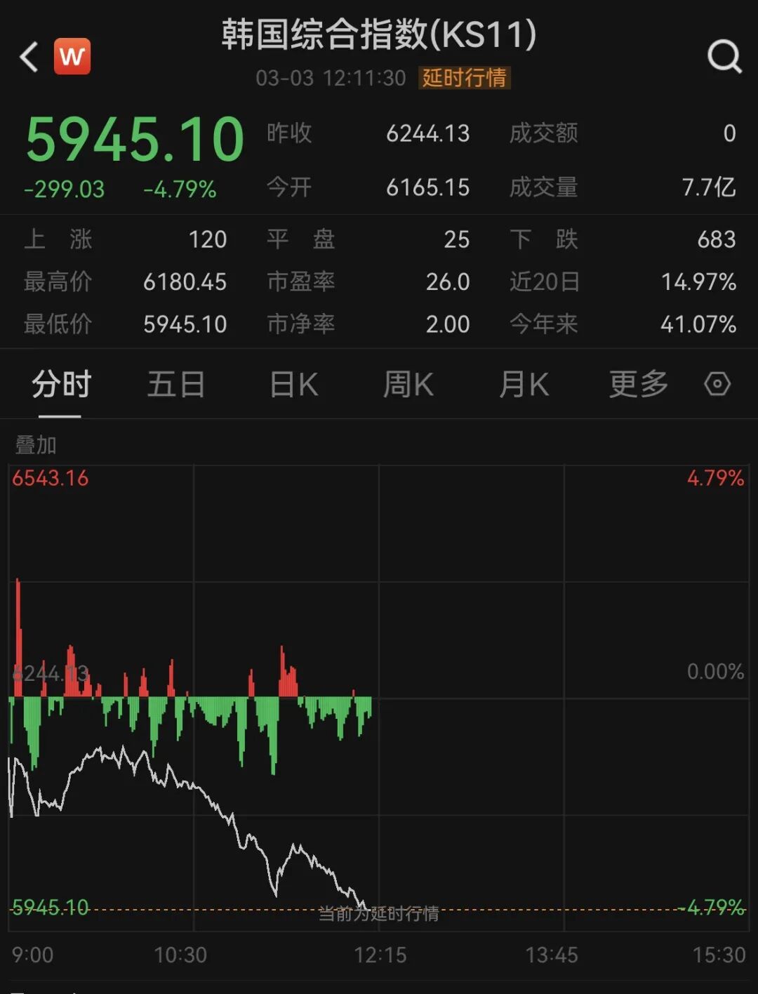 韩国综合股价指数(KOSPI)3日暴跌超过4%,触发熔断机制。