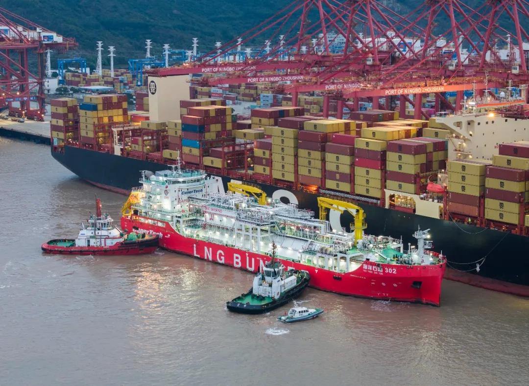 宁波舟山港的集装箱船和LNG船。省海港集团 供图