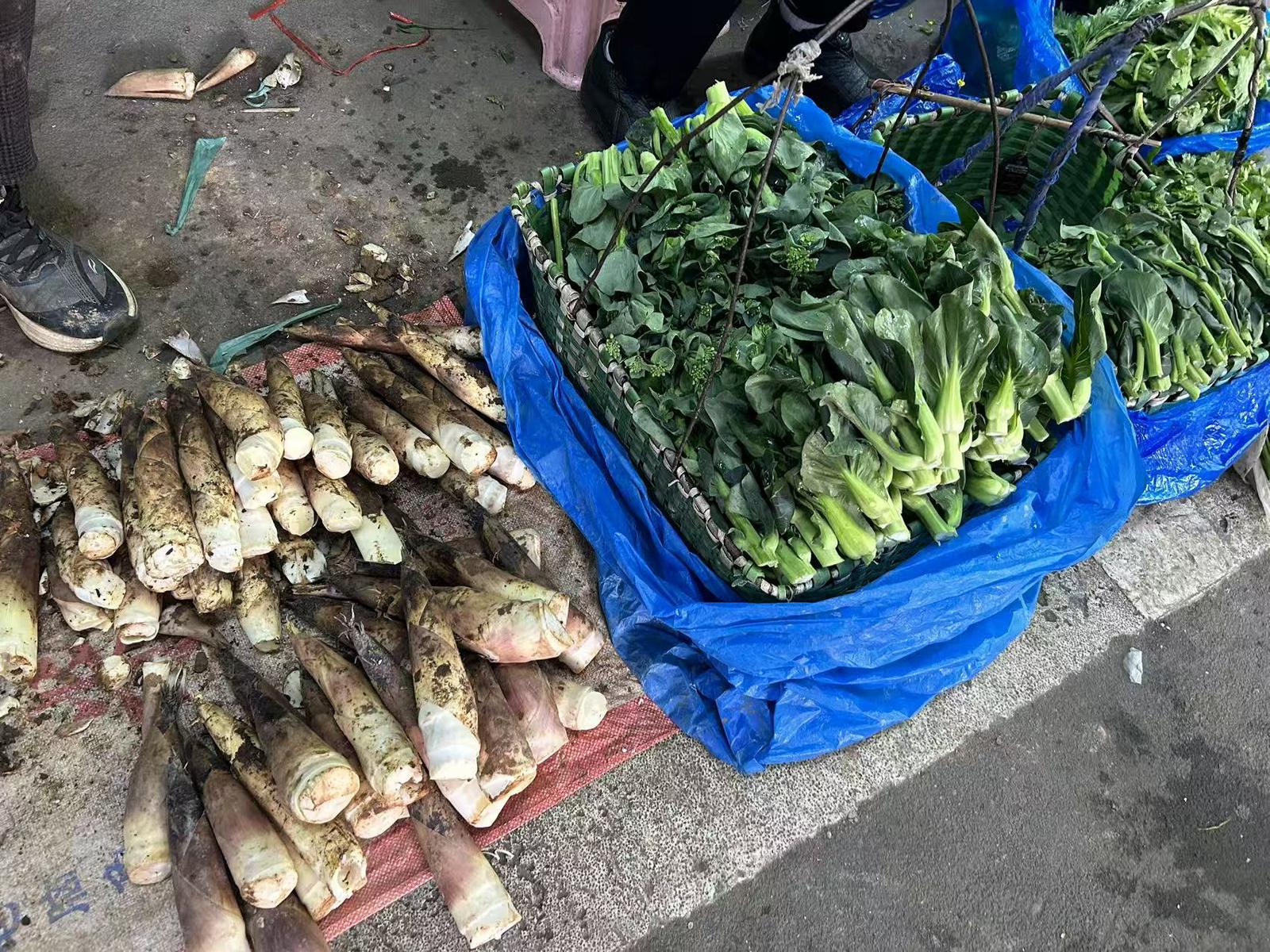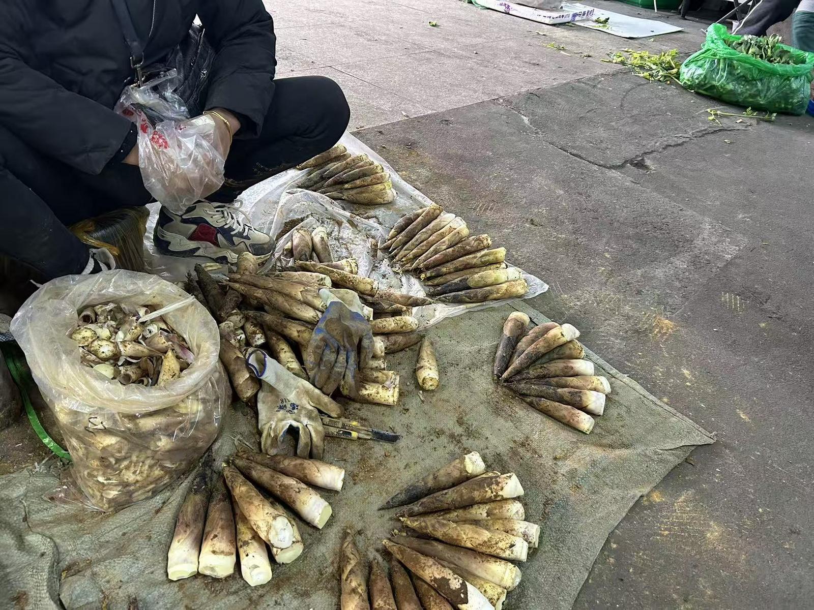 记者在市场里转了一圈,发现自产自销区的菜品有青菜、萝卜、芹菜、大蒜、春笋,大多是本地当季蔬菜。阿姨叔叔们各自的摊位很小,几个塑料袋、一个盘子可能就是一个摊位。卖的蔬菜普遍比市面上的便宜很多,比如,春笋在这里一斤只卖5-6元,而在盒马、叮咚等生鲜电商平台上,同样一斤要卖到9-14元。