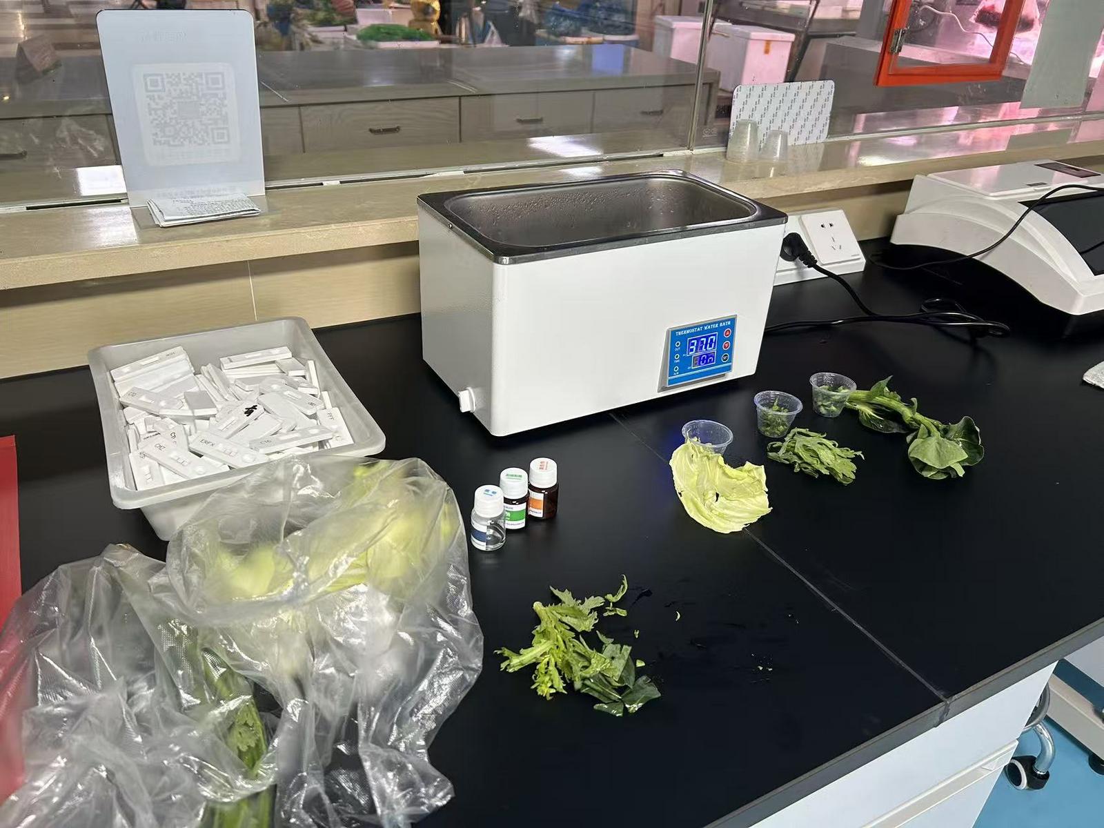 为了让百姓们“卖菜安心、买菜舒心”,市场还每天对农户们的蔬菜进行抽样检查。“虽然是本地农户种的,很多不用农药,但食品安全必须严格保证。”市场检测员罗女士说,“我们检测室每天会检测24个样品,测试10-11个项目,确保消费者买得放心。”
